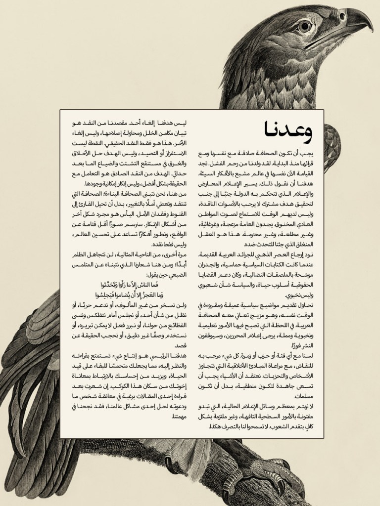 تَعد مجلتنا بالقليل. لكن ما تعد به جوهري، ويتمثل في محاولة تقديم مواضيع سياسية عميقة ومقروءة في الوقت نفسه، وهو مزيج تعاني معه الصحافة العربية. في اللحظة التي تصبح فيها الأمور تعليمية ونخبوية ومملة، يرجى إعلام المحررين، وسيوقفون النشر فورًا.